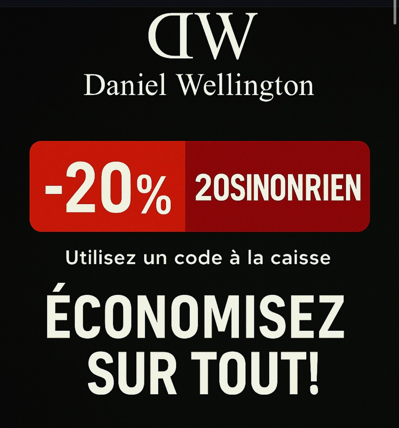 C’est l’Élégance intemporelle, maintenant à prix doux ! Profite de -20% sur toute la collection Daniel Wellington avec le code 20SINONRIEN Montres raffinées, bracelets minimalistes, accessoires stylés… le luxe accessible, c’est maintenant.